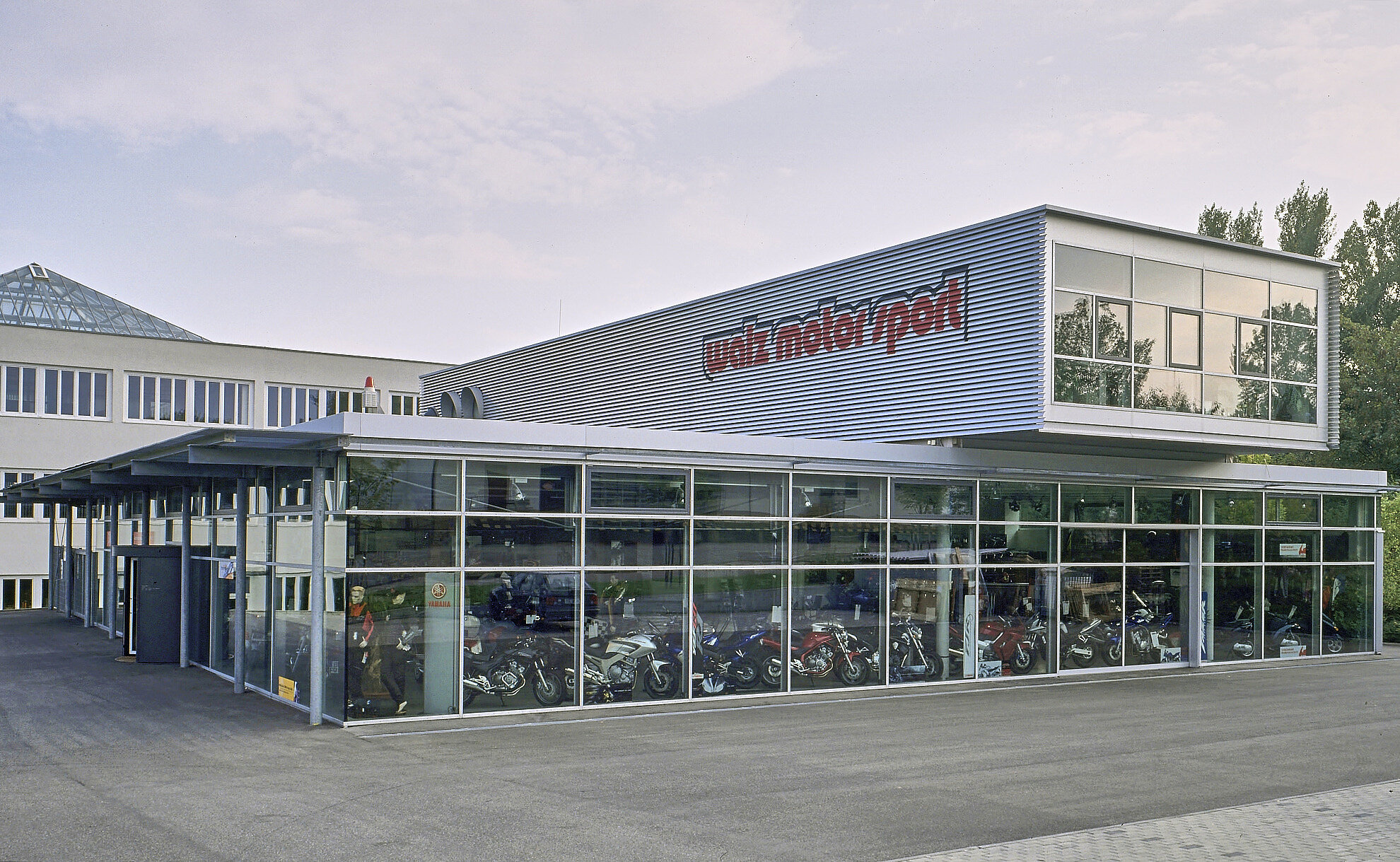 Als Material für die Fassaden und Außenwandverkleidungen wurden ausschließlich Aluminium und Glas verwendet. Dies unterstreicht die Einfachheit des Entwurfes, gleichzeitig stehen diese Materialien für Technik und Präzision und sind damit Teil des Werbekonzeptes. Die geschlossene Obergeschosswand erhielt durch eine Lamellenverkleidung eine horizontale Struktur, die Geschwindigkeit symbolisiert.