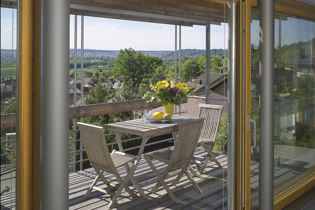 Da nur geringfügige Befreiungen möglich waren, und das gewünschte Raumprogramm für das Baufenster zu groß war, wurde ein Grundriss vorgeschlagen, der durch seine Flexibilität den fehlenden Platz wettmacht. Wohnraum und Schlafzimmer, das Büro und die Kinderzimmer bilden jeweils in sich geschlossene Einheiten, die bei Bedarf abgetrennt werden können. Der Wohnraum wurde nach oben gelegt, um die Aussichtslage und die Ruhe der östlich hangaufwärts anschließenden Obstbaumwiese nutzen zu können. Von dem auf der Westseite über dem Eingang angeordnetem Balkon geht der Blick weit in die Landschaft und hinüber zur Silhouette der Altstadt.